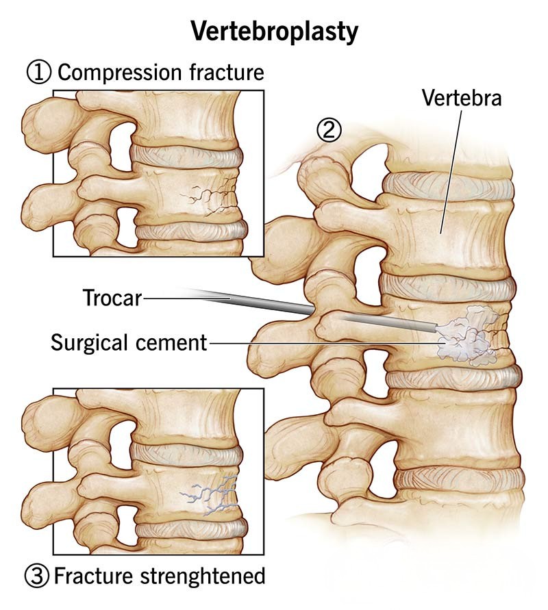 Vertebroplasty: Medical-grade bone cement is injected into the fractured vertebra to stabilize it.